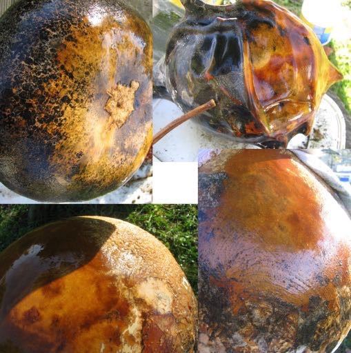The top part of the first photo shows the result of six hours of scrubbing from a recent gourd cleaning day. The lighter spots on a couple of the large gourds are blemishes that I’ll have to design around. Every one of these gourds were covered in yucky stuff (aka mold), as you can see evidenced in the photo below. But, there are beautiful golden brown canvases under all that black, white, and gray fuzz. Go forth and make your world a more gourgeous place by growing, curing, and cleaning gourds.