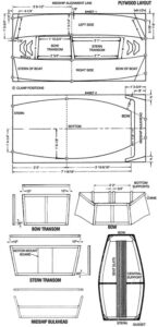 Going on to the second plywood sheet, use your hardwood strip “ruler” to draw the boat’s bottom, employing the same bend-and-trace technique used when drawing the sides. Then, cut out the bottom, leaving a surplus of 1-1/2 to 2 inches around the pattern on the sides and at the bow. It will be trimmed away later. With that done, you can cut out the second side and the transoms, and also draw and cut out the midship bulkhead.