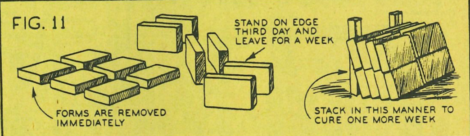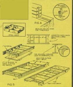 For the key bricks, adjoining door, and window openings, wooden blocks are nailed inside the molds, as shown, and for rounded corners, curved pieces are installed. A mold, making several smaller bricks for fillers, will come in handy and nave splitting the standard size brick.