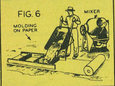 In preparing the ground, remove all organic matter and roots. The slab is poured over cinders or crushed stone, spread over the entire surface to an 8 inch depth, and well tamped. This fill serves the double purpose of insulation and waterproofing. Over it place a layer of reinforced building paper and cement the joints with hot asphalt.