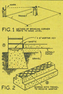 The first step is to grade the site and get the corner stakes level with a transit. Trenches for the footing are dug and flooded with water overnight. The simplest footing design is shown at A, Figure 2. This has a shallow key for mortar upon which the first course of brick is laid. In the inverted T design, B, the top is scored with a trowel to retain the mortar. This is the method used in the author’s home.