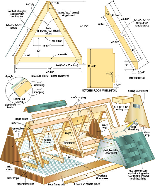 The plans show important details on how the sheathing attaches and how the doors work. Take a look before you decide on your own approach. Trace your truss frames on the sheathing to determine layout lines, then saw the sheathing to shape. Sheath the three walls that need plywood, and get the sliding door working. A vent on top of the roost’s exterior door, together with the inner sliding door, assure ventilation for the birds during hot weather. When the weather gets cold, you can block the vent with a piece of cardboard and close the sliding door each night.