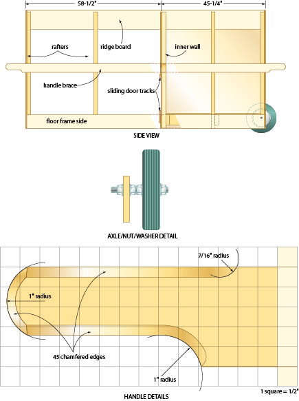 The coop is framed with a series of truss-like triangles connected by a ridge board at the peak and a floor frame around the perimeter. The grazing area is enclosed in predator-proof, 1-inch galvanized welded-wire mesh, while the indoor roost is protected by shingle-covered 1/4-inch exterior plywood. If you’ve got two people to move the unit, you can simplify the project by omitting the wheels.