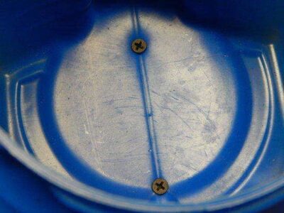 With the lid off of your can, use your drill to insert two screws through the back part of the can and into the board you are using for a backing/mount. You’ll want to do it this way, because coming from the back side of the board and through the can will leave the pointy ends facing inward, and you don’t want a bird to be hurt in this way. We used two spare 1 inch sheetrock screws for this, as they’re short and provided just enough length to attach the can to the board.