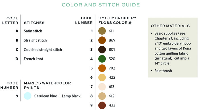 - Embroidery floss: DMC 422, 433, 520, 611, 612, 613, 782, 801, and 869