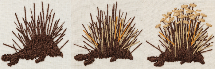 - Stitch the foreground. To add the dead rabbitbrush, first satin-stitch a mound in color 801 using six strands. From that base, extend two-strand straight stitches 1 to 2 inches long in all directions for the stems in colors 801, 782, and 611. Stitch with the darkest dark first, shift to your midtone, and finish with the lightest color. Create the top of the rabbitbrush with small, six-strand straight stitches. Use color 422 for the foremost rabbitbrush and 782 for the one farther back. You generally want to orient these stitches horizontally on top of the stems, but use a variety of stitch lengths and directions to make it look organic. Next, create French knots in color 613 on top of the straight stitches.