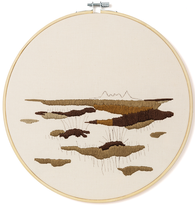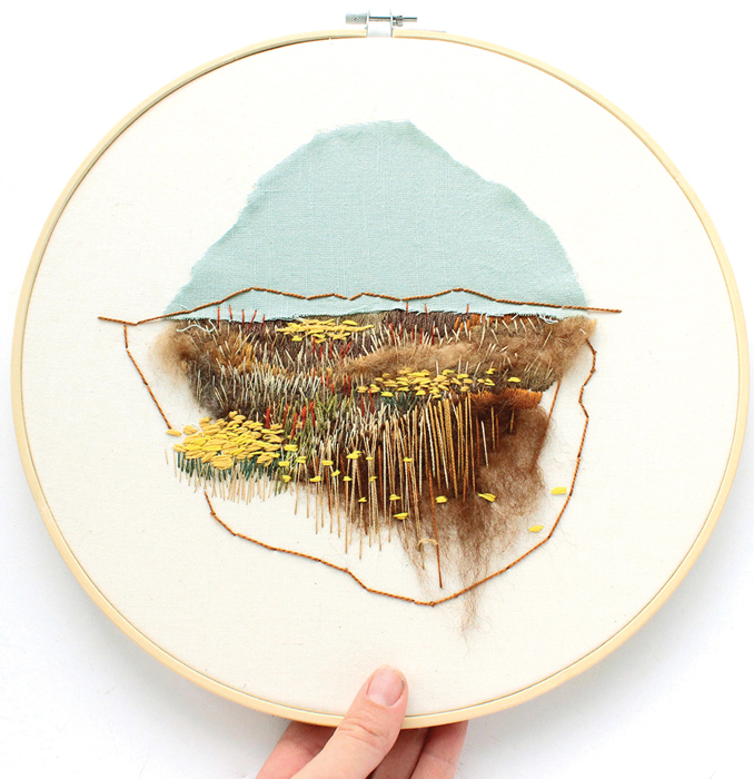 In this new season of my life, moments of the everyday and the ordinary had become almost painfully beautiful to me. Embroidery was a practical way to contemplate those ordinary things. Spending hours stitching the shift of colors and textures in the petals of a California poppy or studying the subtle brown of a patch of dead blue grama grass became small, intentional reflections on beauty that were just as meaningful and connected to the bigger questions of ecology and humanity that had always held my interest. Stitching these subjects is a grounding, meditative process for me, and the practice has integrated into the rhythm of my life and my children’s lives. In both form and function, thread is the perfect material for exploring landscape art and nurturing a connection to nature.