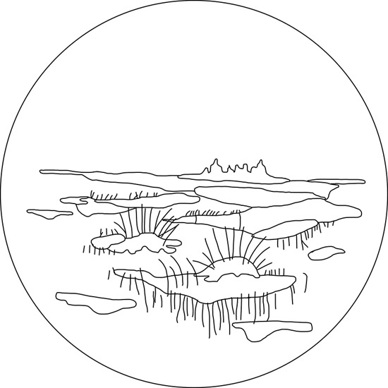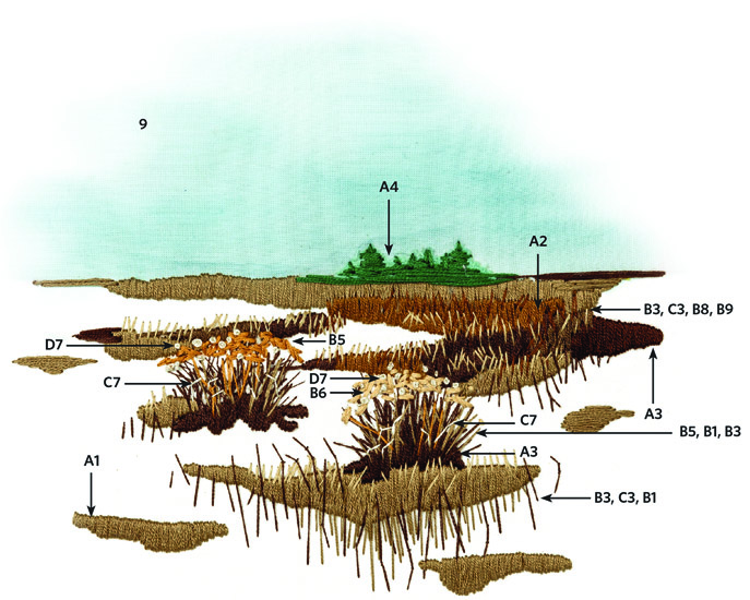 Use a two-strand couched straight stitch in your lightest light color (613) to add a few pieces of bent grass to each rabbitbrush, which will make the plants look realistic and draw attention to them. Finally, layer grass on top of your satin-stitched areas with two-strand straight stitches and couched straight stitches in colors 801, 611, 612, and 433. Leave the area nearest the horizon line free of any detail to create atmospheric perspective and a sense of depth.