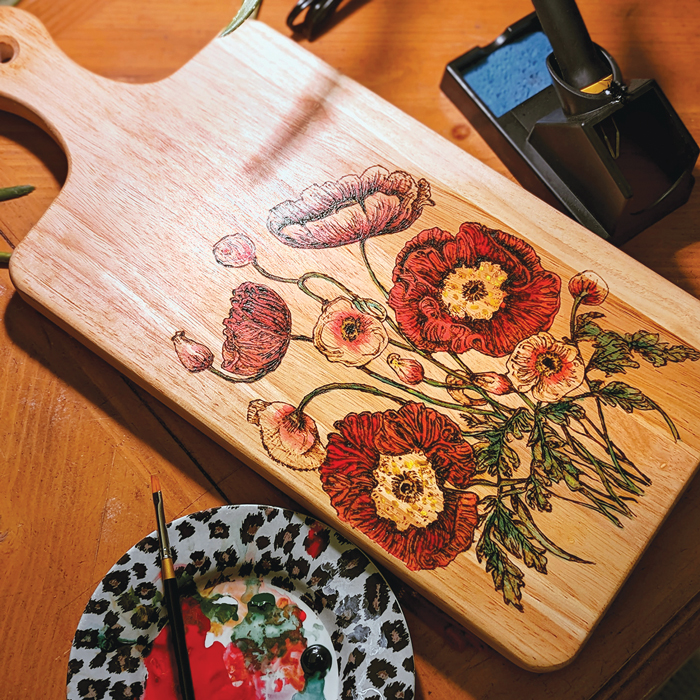 Before adding color, first consider how your loved one will use the cutting board. Many permanent paints, especially red pigments, contain toxic ingredients, such as cadmium. If the board will serve as an art piece, this is less concerning. But if the recipient might use the board for food, select nontoxic paints or forgo color.