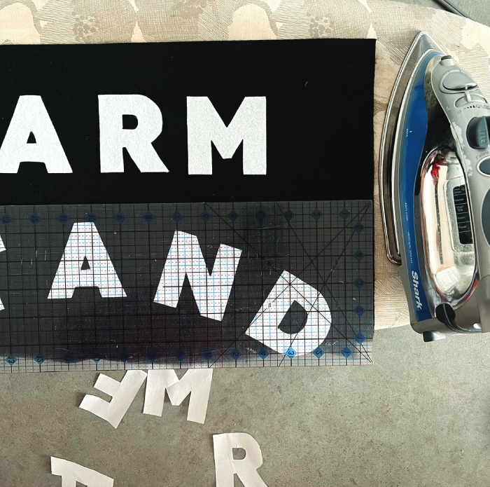 - Cut your background felt to size – tailor’s chalk works well to mark your straight edges if you don’t have a long ruler. Near your ironing station, arrange the letters on the background felt. Once you’re content with your overall design, remove the paper backing and iron on the letters, one at a time. Again, use a high heat setting and iron long enough to form a strong bond.