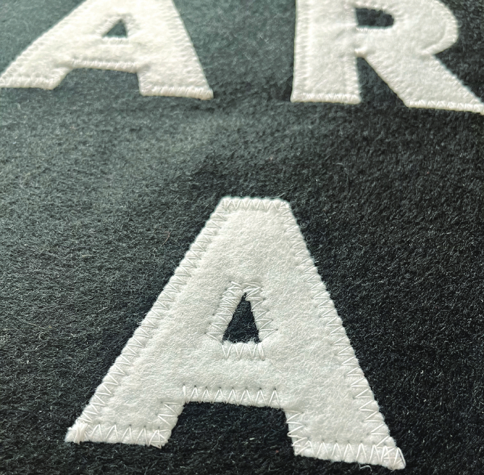 - At this point, your banner is ready to use; however, I recommend using a sewing machine or needle and thread to secure your letters and make a long-lasting, professional-looking banner. Use the zigzag stitch on your sewing machine to sew around the outside and inside edges of each letter, backstitching at the beginning and end each time. Rounded edges can be tricky for beginners – go slowly, and on tight corners, leave your machine’s needle down, raise the presser foot, and turn your work to a better angle. Trim your threads close to the felt and continue until all the letters are sewn down. If you’re sewing by hand, use a blanket stitch for a neat look.