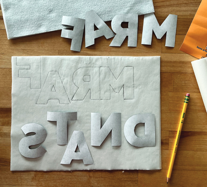 - Using your letter templates, trace your letters backward on the paper backing of the interfacing that’s now ironed onto your felt. The interfaced side of the felt will be the back side of your letters in the next step. Cut out each letter. Folding the letter in half and cutting into the inside space can help you with removing any small interior spaces.
