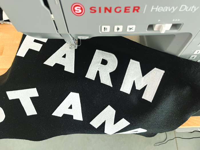 When gathering your materials, think about your banner’s finished size and shape and the number of letters you’ll need to fit onto it. Felt can be purchased by the yard or in 8-by-11-inch sheets – you’ll need a large piece for your background, and you can use smaller pieces for your lettering. For reference, the words “FARM STAND” used one 8-by-11-inch sheet of felt. A yard or more of felt for the background of the banner will be sufficient. Choose contrasting colors so your words stand out from a distance – black and white is a classic combination, but don’t feel limited by that.