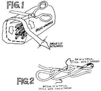 There’s nothing complicated about preparing the bread wrappers for crocheting. Start at the open end of each empty bag and cut a continuous spiral–about an inch wide–around and around the sack until you reach the part that’s glued together on the other end (this small remaining piece is all the waste you’ll have to throw away). The beginning and end of each strip should taper to a point (Fig. 1). One tool–a single metal crochet hook of the size used for rug yarn–is the only equipment you’ll need to turn even the biggest stack of wrapper spirals into durable and colorful floor coverings. Do make sure that hook is metal, though, because plastic ones have a tendency to stick to the wrappers.