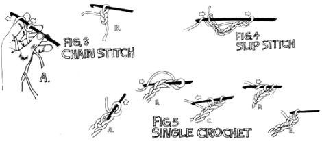 A square or rectangular rug is made a little differently (by working back and forth instead of round and round). Begin such a design with a series of chain stitches as long as the desired width of the finished work . . . then chain three more times, turn and single crochet the next row using the top of the chain stitches as a base. When you reach the end of the line of single crochet stitches, chain three times, turn (the other way this time), add another row of single crochet stitches, chain three times, turn the way you turned the first time, etc. Continue this back-and-forth pattern until the rug is as long as you want it.