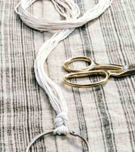 - Cut the cord into four 18-foot pieces and place them through your metal ring.