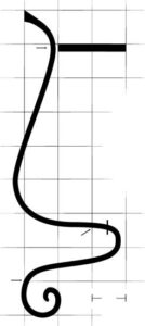 3. Forge a taper in the end of the leg piece, and curl it into a scroll until the length matches the template. Bend the scrolled end at a right angle to the plane of the rest of the basket.