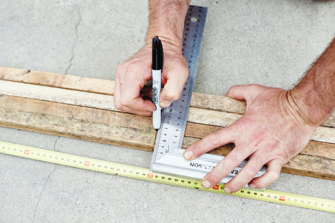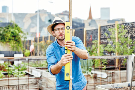 4. It’s time to attach the four wooden stakes to each corner of the crates. Have the L-brackets facing out and use a spirit level to make sure they are perfectly level.