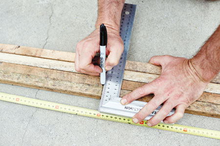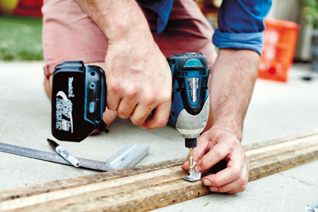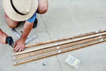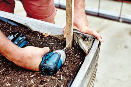 5. When securing the stakes to the crate, make sure they are all set at the same level. We drive each stake 12 inches underground and then use two 1-1/2-inch timber screws to fix them to the crate.