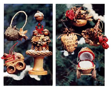 Using such ordinary natural objects as walnuts, acorns, seedpods, and dried flowers, Virginia creates intricate ornaments that fairly shout with ingenuity (have you ever seen a walnut-shell hot rod or baby buggy before?). Grapevines, dried flowers, grasses, and nuts serve as ideal trimmings, and the addition of a scrap of felt or flannel, some rope, a bit of yarn, and a touch of all-purpose glue, transforms these natural finds into delicate pieces of artwork. Virginia does advise purchasing the walnuts, though, to ensure that you’ll have unblemished shells. Jumbo size nuts work best.