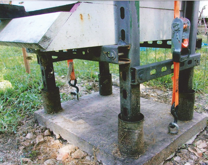 Several years ago, a passing black bear found our honeybee hive in the night and turned it upside down. Being the third- generation carpenter that he is, my dad pulled out his form boards, leveled them, and poured concrete. Once the concrete dried enough for them to stand up on their own, we sank in 1⁄2-inch-by-5-inch eyebolts. After the concrete dried, he set his hive stand (which is handmade from U-channel post) and the beehive on it. Last of all, he hooked a ratchet strap onto the eyes and cranked it down. We never had another hive turned over.