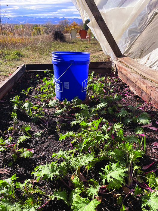 When very low temps are forecast, I fill a 5-gallon bucket with hot water from the kitchen tap and place it inside the hoop house, tucked in between the plants. The heat radiates all night and keeps my plants cozy even when temps are in the teens. The next day, when the air warms up and the water has cooled, I decant water from the bucket out into the bed, an easy way to keep the plants moist when the hoses are disconnected for the winter.