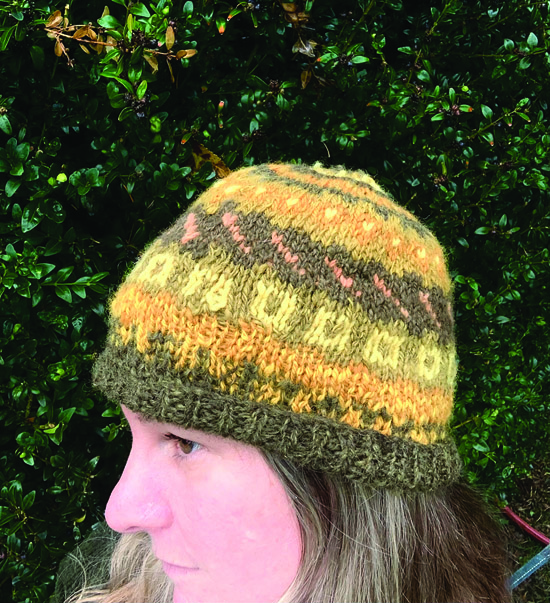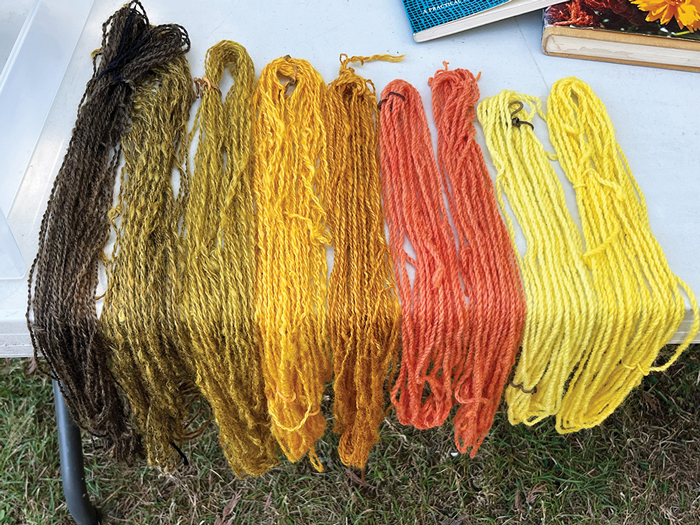 Dyeing my hand-spun wool with local plants is both fun and rewarding, but older dye recipes often call for chemical mordants that are toxic or hard to source. However, using a mordant is often essential to set the dye, so I’ve been using homemade iron and copper mordants for years with excellent results. For an iron liquor, I simply gather rusty nails and other bits of iron in a glass jar and fill it with vinegar. The copper liquor is the same process with copper pipe and vinegar. One hundred milliliters of mordant is usually plenty for 120 grams of wool. You can soak your wool in the mordant either before or after your plant dye bath to get an interesting range of colors! To pre-mordant wool, fill a nonreactive pot, such as enamel or stainless steel, with enough water to cover the fiber. Then, heat it to a gentle simmer and add both the measured mordant and pre-scoured wool. Simmer gently (but don’t boil) for 45 minutes. Then, gently squeeze out excess water and proceed to the dyebath. For an after-dip, follow the same mordanting process after the dyebath until the desired shade is achieved. These colors are all from one coreopsis flower dye bath, and this is the hat I knit using those samples.