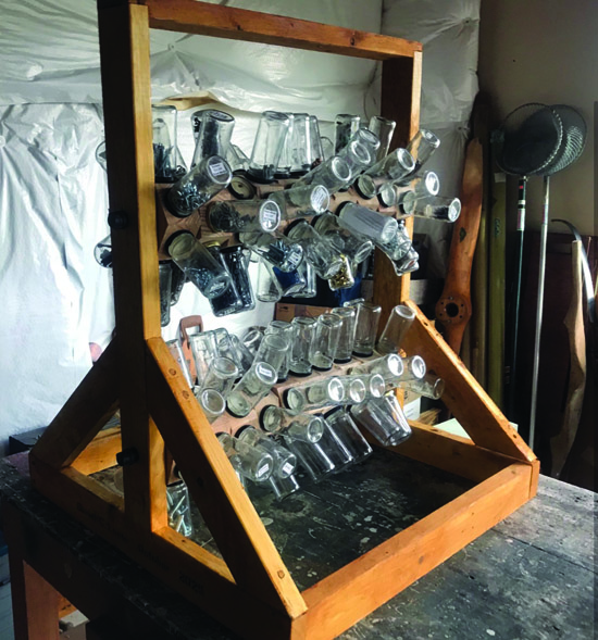 I like to make stuff. I also like to save things. If I purchase 50 screws and use only 40 of them, I’ll save the remaining 10. For that endeavor, my wife calls me a packrat. I also have a tendency to forget where I put stuff down. A friend says that’s typical of old age. Well, to keep track of everything and maintain the sense that I’m a better-than-average craftsman, I’ve created this easy-to-make 120-bottle rotating rack, which seems to solve the above issues. I store bolts, washers, nuts, grommets, and all sorts of other small items. I used empty olive bottles plus six-sided (hexagonal) pieces of wood that I cut from a 6-inch-wide board that was 8 feet long and 3 inches thick. I used 1/2-inch black iron pipe through the hexagons to support the containers; they can get quite heavy when filled. Don’t attempt to match what I did exactly. Create your own perfect storage solution!