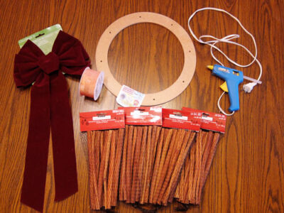 1. Choose one side of your wreath ring; hot glue the thickest cinnamon sticks onto its base, working your way around the ring. Angle the cinnamon sticks so that they point outward with a natural slant.
