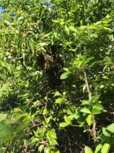 The swarm we captured landed on an Autumn Olive shrub about three feet off the ground next to a pathway. It was as if the bees were begging to be placed in a hive.