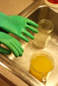 - In a heavy, heat-proof glass container (like a large mason jar) measure out the cold water. Slowly add the pre-measured lye to the water. Never add the water to the lye as it may explode everywhere. Using a wooden spoon, gently stir the water-and-lye mixture. It will heat up considerably. I like to set this jar in the sink to cool, so it is well out of the way, and if it spills, it just goes down the drain and you can wash it away quickly with cold water. Allow the water/lye mixture to come to room temperature. Check the temp by resting your gloved hand on the side of the jar. Do not stick your finger in the water! You may also use a glass thermometer, but I prefer to keep my lye contact to a minimum.