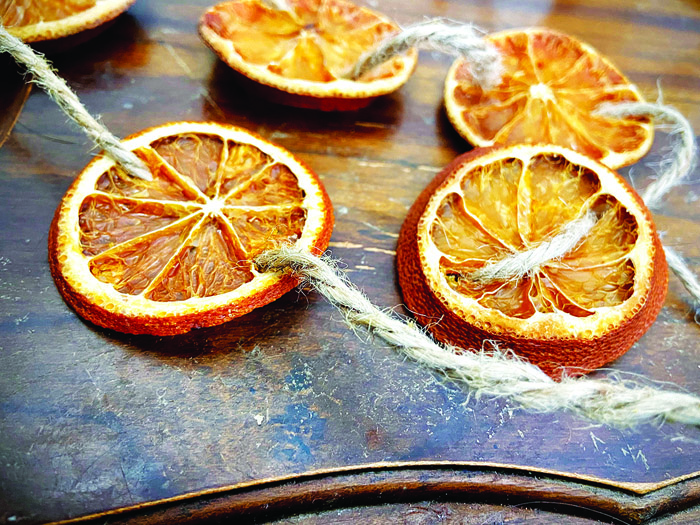 16 A garland made of dried orange or lemon slices. Slice your citrus of choice about 1/4 inch thick, and then sprinkle with cinnamon if desired. Dry completely in a dehydrator or in your oven on its lowest setting, and then string on twine.