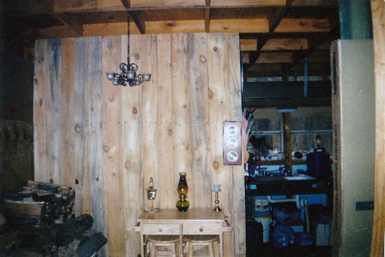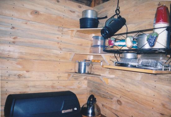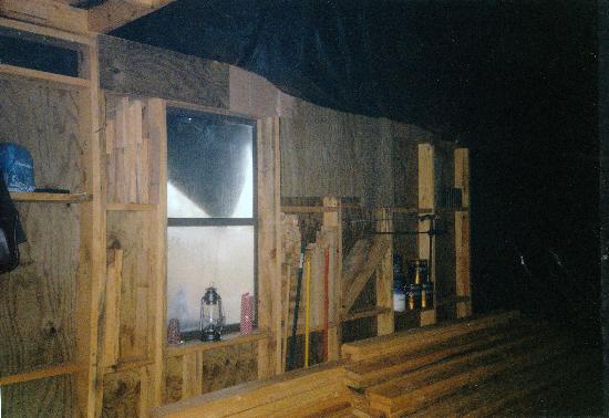 covered the front of this wall with 1x pine planks that were sawed from the property. I left the “kitchen” side bare and used the cavities in the framing for storage. This arrangement proved very handy, and is still in use today. The picture of the kitchen corner shows the top of the propane grill I used as a cooking stove. After almost killing myself previously, I made sure to open a window when it was in use. Ventilation is paramount!