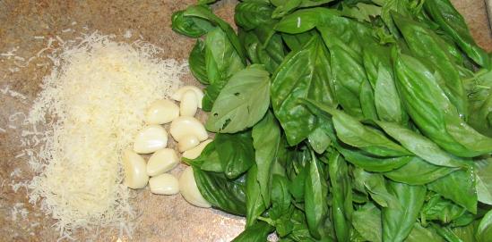 photo credit: basil growing in my hoophouse (top), parmesan cheese, garlic cloves and basil used to make pesto (bottom)