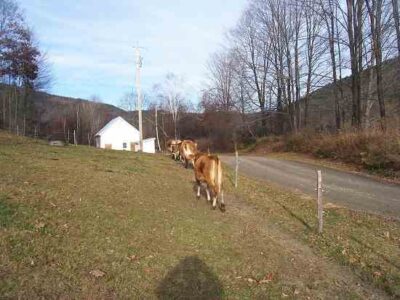 When I do let my cows out during the winter I have to be careful they have good footing and don’t have to walk on ice. Cows hate ice. Their hooves are hard and slippery and cows can slip and fall down fairly easily. Worse yet their hind legs can “split” on ice and do tremendous, even fatal damage to the tendons in their hindquarters. It is a dreadful sight. I recommend keeping a couple buckets of salt in the barn during the winter and spreading it liberally if there is ice in the barnyard. If the ice is too bad or extensive just keep the cows inside for a bit. They don’t mind.