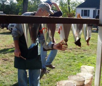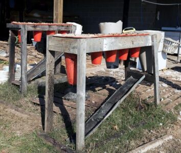 First, we transitioned from the hatchet to five “killing cones” made out of sheet metal, using a pattern out of the “Anyone Can Build a Tub-Style Mechanical Chicken Plucker” manual by Herrick Kimball. I feel the cones allowed the birds to remain calmer and eliminated the risk of a misdirected hatchet stroke. Each cone was positioned over a 5-gallon bucket so the blood could later be transferred to the compost pile.