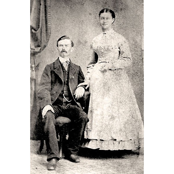 The wedding photograph shows Augusta at almost sixteen, a young lady in an ornate dress, her dark hair pulled back rather severely, with deep-set eyes and just a trace of a smile. She appears slightly plump, although tightly corseted. There is an air of gentleness about her face and hands. Otto is a slim man with a thick shock of dark, rather unruly hair. His ears are prominent, a feature later passed on to the next generation; he has a large nose, sloping shoulders, and keen blue eyes. His mustache does not quite disguise an unusual facial shape, perhaps caused by a slight harelip. While Augusta was pretty, Otto was probably not considered exceptionally good-looking. Both, however, had the strength to work hard to make a beginning in a difficult new land.