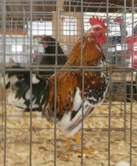 The first show that I went to was the one near Richmond. It was hosted by the Virginia Poultry Breeders Association (VPBA) and was held at the Caroline County fairground. I brought two of my Sumatras, one blue, who placed third out of five, and a black one named Jet (as in the black stone), who placed second out of four.