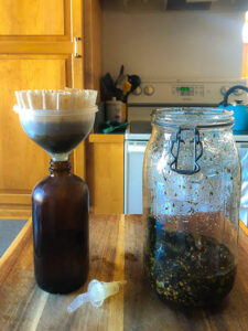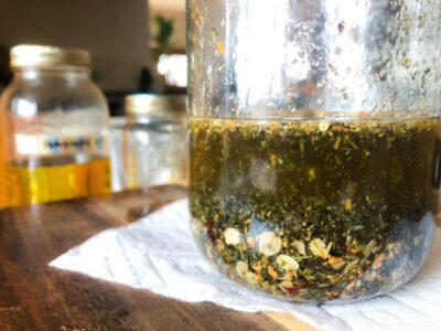 I added the herbs and oils into a large jar and with the lid off I infused the jar in a water filled crockpot on the low setting for 24 hours. It’s important to infuse without the lid on your jar as you don’t want condensation to mix with your oils because it will spoil the oil. Similarly, you can also do this in a larger dehydrator with the temperature between 100 to 140 degrees Fahrenheit for anywhere from 1 to 24 hours.You can also skip the jar altogether and just infuse the oil directly in the crockpot. I used a funnel and coffee filter to strain my oils as I had tiny bits of plant materials in my oil.