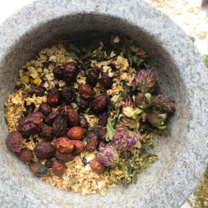 I added a hodgepodge of plants and herbs to this infusion, a little bit of this and a dash of that. I allowed my intuition to guide me in the process and I advise you to do the same- it always knows best. I included dried rose hips, chamomile, elderflowers, red clover, yarrow, tulsi, wild rose, plantain, and oatmeal. I wish you could have smelled my mortar and pestle once I was done grinding it all up because it smelled incredible!