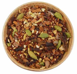 Holy basil is an important adaptogenic herb in India that helps the mind adapt to incoming stressors. Chai is spicy, mildly stimulating, and balancing. You can use a rooibos, green tea, or black tea chai for this blend, depending on the amount of caffeine you want in the afternoon.