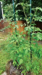 If the containers are on a surface adjacent to dirt or lawn, you’re in luck. Drive the stake into the soil and position the containers at the edge so that plants can be tied to the adjacent stake. Tomato cages and similar types of supports can be inserted over the plants into the containers, but they, too, will likely become unstable and topple over as the season progresses; position a pot filled with soil next to the caged plant and tie the cage to the stake in the plant-free container.