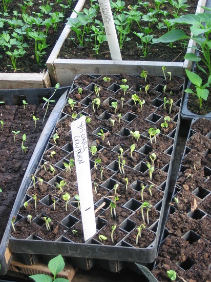 Usually we transplant our okra, sowing on April 15, using soil blocks or Winstrip 50-cell flats. Okra grows slowly until hot weather arrives. We sometimes take advantage of this and its upright growth habit to transplant it into a bed of early cabbage. We transplant cabbage in two rows along a 4′ (1.2 m) bed on March 10 and the okra in a single row down the middle on May 11. At first the cabbages are relatively small and the okra uses open space in the middle of the bed. As the plants grow, we remove any outer leaves of the cabbage that might overshadow the okra. Finally, in late May and early June, we harvest the cabbage and leave the okra to grow to full size. This method saves space and efficiently uses our time to help two crops with one weeding.