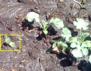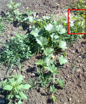 Slow germination is another issue that can cause the weeds to get a head start over crops. As landrace gardeners we can select among genetically diverse populations for genes that lead to quick germination. I’ll again use watermelon as the example. This spring about 70% of my watermelon landrace germinated quickly. The 30% that germinated slowly are being eliminated. I drew a yellow box around a slow germinating seed. It was pulled immediately after taking the photo.