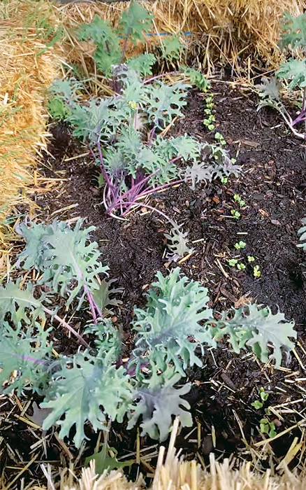 Here’s how it works: In early spring, I get six bales of straw and lay them out in the yard in a rectangle. I start composting in the enclosure by adding organic matter. Materials for compost can be hard to come by this time of year, so we have to get creative. Along with my own kitchen scraps, I collect grounds from local coffee shops and imperfect organic produce from the health food store. (Some of the produce isn’t all that imperfect by my standards, so I admit I eat some too.) Most of that stuff is high-nitrogen “greens,” so if I don’t have enough dry plant residue from last season lying around, I buy an extra bale of straw to add some carbonaceous “browns.” Then, I mix it up and moisten it. After a couple of weeks, the hotbed will be generating gentle heat, and it will start to shrink, leaving room to add a half-foot or so of finished compost or soil on top. This seems to give the new plants room to grow without mixing too much with the actively decomposing material, which can rob nitrogen from them. I transplant hardened-off kale, broccoli, and other seedlings into the bed and also direct-seed radishes, arugula, and cilantro. The straw bales are multitasking throughout the season. They form the insulated walls of the compost-bin-raised-bed combo, and they can also support a cold frame for early season protection. Then, all summer, I can grow lots of veggies in them using trendy straw bale gardening techniques!