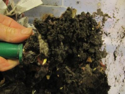 Second best is to use the drier, screened vermicompost that I get from my outdoor worm bins. This needs to soak longer for it to dissolve. I use city (chlorinated) water and let it set overnight (rainwater would be better — but it’s not raining). I pour 1/2 to 1 gallon of the tea directly on the roots of teach tomato plant.