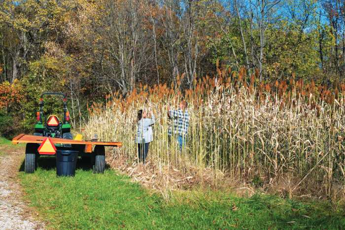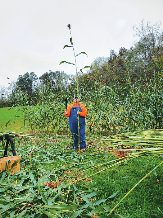The first step in processing sweet sorghum syrup is to harvest the cane from the field. First, we remove all the leaves from the standing cane. Then, wielding our trusty cane knives, we proceed down each row, cutting the cane at the base and gathering the bundles. The cane is then loaded onto a truck or hay wagon, where we remove the seed heads to retain them for next year’s seed and poultry feed.