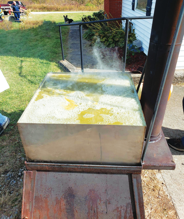 As the raw juice is cooking, impurities rise to the top in a coagulated foam that should be skimmed off. The more impurities you can skim, the better your finished product will be. As the density of the juice increases, you’ll begin to see the transformation from juice to syrup.