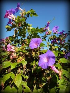 Morning Glory (Ipomoea purpurea) Saucer-shaped flowers in the colors of a summer sky are produced anew each morning on this old-fashioned cottage garden favorite. Grows 8 to10 feet in full sun. Not to be confused with nasty bindweed, a noxious weed.