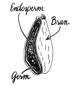 - Whole-wheat flour contains the entire ground-up kernel: the germ, or embryo, rich in oil, vitamins and minerals; the endosperm, or main body of the kernel, filled with starch and protein (including the gluten); and the bran, or hard seed coat. Compared with white flour, which contains only the endosperm — the germ and bran are milled out and sold separately — whole-wheat is rich in flavor, fiber, nutrients and fat. Alas, fat turns rancid quickly. While white flour is virtually imperishable, whole-wheat keeps only about a month at room temperature, or two under refrigeration, before it starts to become bitter. It pays to check the expiration date on supermarket packages, or to question the shopkeeper when buying from bulk bins. The unused portion should be wrapped in an airtight package and stored in the refrigerator.